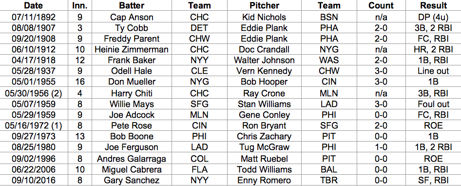 En revanche, c’est aussi un renoncement à l’exploit individuel, l’une des bases fondamentales de la beauté du baseball, car il arrive que sur ces lancers hors zone un coup sûr surgisse. C’est rare mais c’est cette rareté qui donne son sens à l’exploit. La Society for American Baseball Research a établi la liste des frappes sur un BBI dans les Ligues Majeures. Seulement seize joueurs ont réussi cette performance selon leurs recherches dont les légendes Willie Mays, Ty Cobb et Pete Rose. Les deux derniers en date sont Miguel Cabrera en 2006 et Gary Sanchez en 2016. Sur ces seize frappes, treize ont donné un résultat positif (coup sûr, sacrifice fly, point produit, etc) et neuf ont produit un point ou plus. Et cinq de ces frappes ont eu lieu en extra-inning !