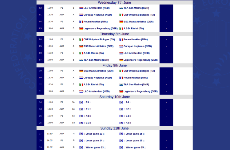 Mais si Rouen passait cette première phase, il lui faudrait affronter les prétendants de la poule B soit le champion européen en titre, le L&D Amsterdam, San Marin et l’hôte de la compétition, Regensburg. Les Pirates d’Amsterdam n’ont gagné que quatre titres de champion et le dernier remonte déjà à 2011. Mais leur titre européen a démontré que tout club hollandais en coupe d’Europe est un prétendant naturel à la première place et le club domine l’Hoofdklasse, la première division hollandaise.
