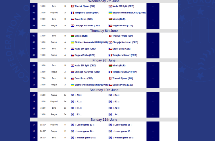 Dans la poule A, Sénart affrontera les Eagles de Prague, les croates de Karlovac et les ukrainiens du Biotechkomanda KNTU. Les Eagles auront la charge de récupérer la place tchèque en Champions Cup perdue l’année dernière par un autre club de la capitale, le Kotlarka. Le club pointe actuellement à la cinquième place de l’Extraliga avec une fiche positive de 16 victoires et 11 défaites. Capables de jouer les premiers rôles, les Eagles n’ont jamais été l’une des équipes dominantes de la première division tchèque, contrairement au Draci Brno. Un adversaire à la portée des Templiers.