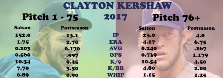 Cette perte de puissance quand approche la septième manche est-elle la raison de tous les soucis historiques de Kershaw en postseason ? Probablement pas tous, 2016 notamment en étant un parfait contre-exemple. Mais en ce qui concerne 2017, cela pourrait être bien la réponse, que le blocage soit mental ou physique (Kershaw souffre notamment depuis plusieurs saisons de soucis récurrents au dos).