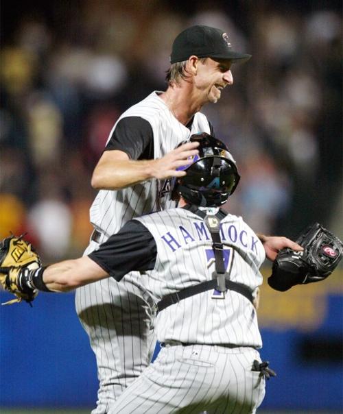 Et alors que les spectateurs sont de plus en plus nombreux à retourner leur casquette pour conjurer le mauvais sort et redoublent d’encouragement pour Randy Johnson, Eddie Perez, s’élance sans succès sur une slider récupérée dans la poussière par le catcher des Dbacks, Robby Hammock. Lui aussi sera un héros de cette soirée. Sa carrière est très anodine, qu’il passera entre le niveau AAA et Chase Field. Souvent utilisé comme utility player, il profite des départs des deux catchers Chad Moeller et Rod Barajas pour prendre du temps de jeu derrière le marbre. Ce match a également une signification toute particulière pour lui, le natif de Macon en Géorgie, à une heure de route d’Atlanta.