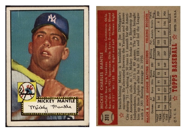 Pour la petite histoire, cette carte numérotée 311 faisait partie des dernières diffusions du set en juillet 1952 (les cartes de 1 à 310 sont sorties en début de saison et celles de 311 à 407 durant l’été). Celui-ci fut beaucoup moins vendu à l’époque car de nombreux fans de baseball se désintéressèrent un peu, leurs équipes n’ayant à cette période de l’année plus aucune chance de participer à la course aux World Series. Les cartes vendues durant l’été furent donc un peu moins achetées et sont aujourd’hui, de façon relative, un peu plus rares que celles du premier set. Topps se retrouva donc avec plusieurs centaines de caisses de ces cartes stockées pendant prés de huit années. En 1960, ne sachant plus quoi en faire, et afin de faire de la place dans leurs locaux, Topps fit évacuer ces caisses qui furent larguées par un bateau au large de la côte Est. Plusieurs centaines de milliers de cartes Topps ’52 et des milliers de rookie cards de Mantle gisent aujourd’hui encore quelque part dans l’Atlantique.