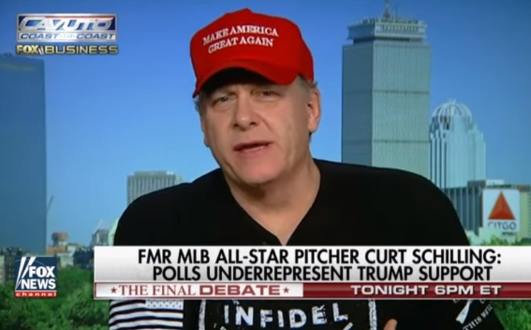 Et puis, il y a Curt Schilling. Le joueur Curt Schilling était un fort en gueule, qui savait autant se faire aimer que détester. Il pouvait recevoir le Roberto Clemente Award ou le Lou Gehrig Memorial Award et endommager une caméra avec une batte en plein match suite à un différend avec des officiels ou dire de Barry Bonds qu’il a triché avec sa femme, les impôts et le jeu. C’était un adepte du trashtalking médiatique. Pas le premier joueur de talent déplaisant, pour rester poli. Rien qui empêche d’être élu au Hall of Fame. Mais après sa carrière, c’est une face sombre que Curt Schilling n’a cessé de montrer. Celle d’une personnalité collectionnant des objets nazis, enfin « de la Seconde Guerre Mondiale » pour Schilling et partisan du créationnisme. En 2015, consultant pour ESPN, la chaîne le suspend alors qu’il est prit à partager sur Twitter un meme d’Adolf Hitler comparant les musulmans aux nazis. L’année suivante, il est définitivement viré après des propos offensants pour les LGBT. La même année, sur une radio, il déclare qu’Hillary Clinton devrait être enterrée sous une prison suite au scandale de ses e-mails. Une année productive qui le verra aussi partager la photo d’un tee-shirt faisant l’apologie du lynchage de journalistes. Ce pro-vie n’hésite pas à partager le drapeau confédéré, cochant ainsi toutes les cases du suprémaciste blanc ou du trumpiste.