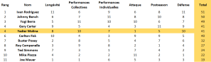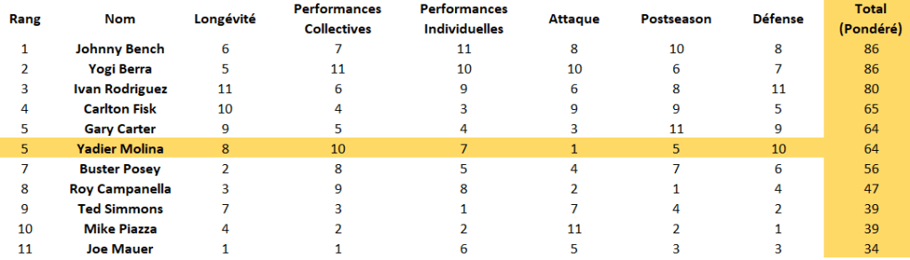 Si l’on exclut les coefficients pour se fixer sur la somme des six critères pris en considération, le résultat ne change pas spectaculairement si ce n’est qu’il honore bien entendu les rois de la défense. Ivan Rodriguez prend alors la première place devant Bench et Berra tandis que Carter et Molina, toujours ensemble, dépassent Carlton Fisk :