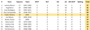 Nous voila donc avec 11 hommes, les plus grands receveurs de l’ère moderne pour leurs capacités offensives ou défensives, leur longévité ou leur participation aux titres de franchises de légende : entre ici Yadi, afin que nous te comparions à Johnny Bench, Gary Carter, Ivan Rodriguez, Carlton Fisk, Yogi Berra, Ted Simmons, Roy Campanella, Buster Posey et Joe Mauer.