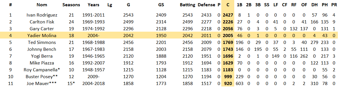 Je le disais en introduction, Yadier Molina est le premier receveur à jouer 2000 matchs au poste pour une seule équipe. Au fil des carrières, des besoins sur le diamant et de l’usure physique, Ils sont cinq, seulement, à avoir joué plus des matchs que le receveur Portoricain des Cardinals au poste de receveur, dont trois Hall of Famers : Carlton Fisk, Gary Carter et Ivan Rodriguez.