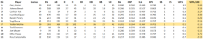 J’utiliserai ici les oWAR, OPS+ et nombres de hits des 11 joueurs pour refléter leur apport offensif général, leur capacité à bien frapper et leur capacité à bien frapper dans le temps.