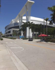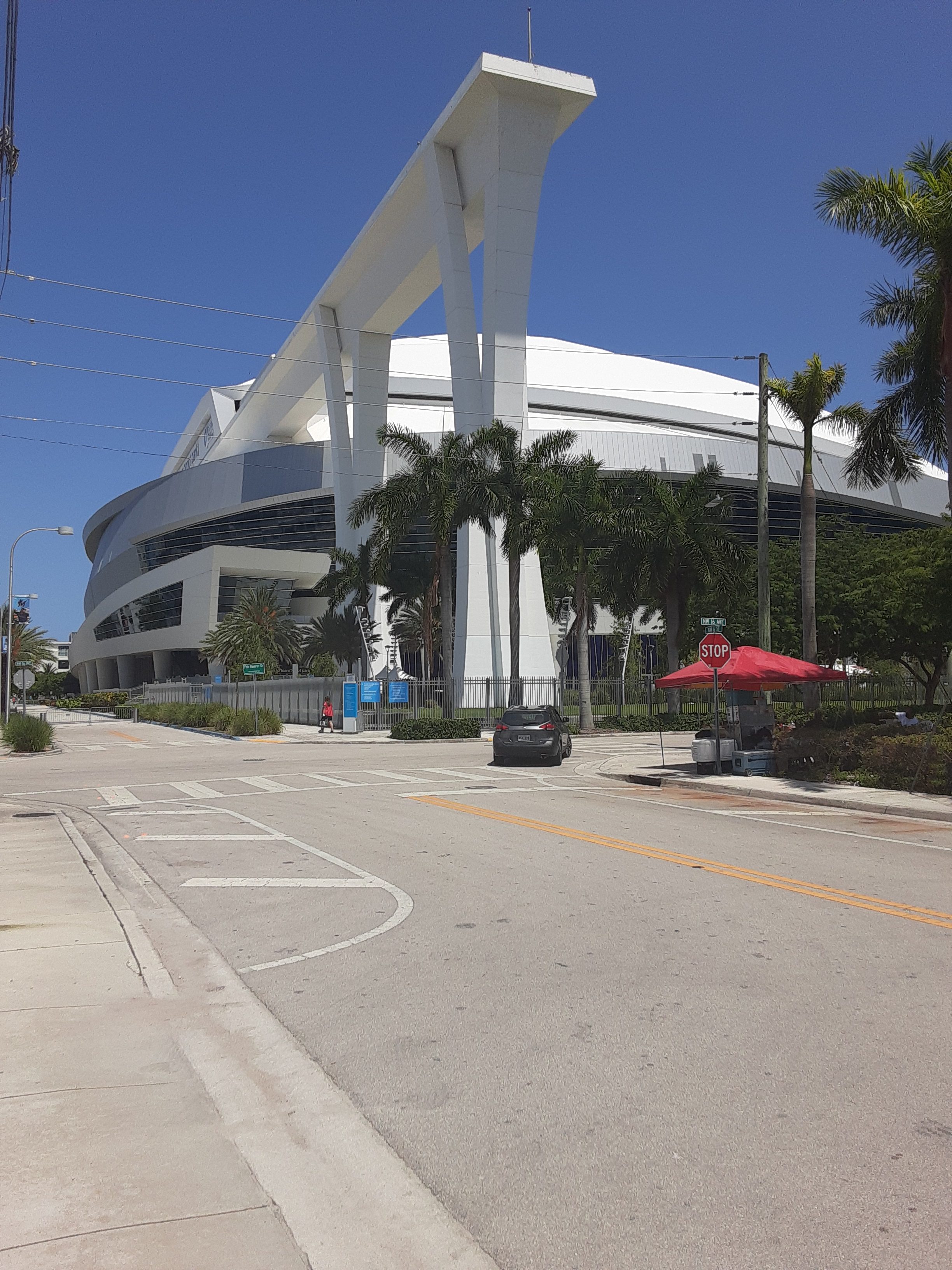 L’ambiance se réchauffe au moment où nous passons devant diverses enseignes « gastronomiques » et ma femme en profite pour me faire faux bond, attirée par des parts de pizza lui rappelant sa ville de Buffalo, pourtant à l’autre bout du pays. Des files gigantesques, peu COVID friendly, dans un Etat très touché par le virus, se trouvent à chaque restaurant, fast food et boutique devant lesquels je passe. La bonne humeur des spectateurs, dans l’attente de leur met, se fait sentir. La langue espagnole se fait entendre tout autour de moi, me rappelant la spécificité de cette ville qui possède une forte communauté cubaine, célébrée d’ailleurs dans tout le stade.