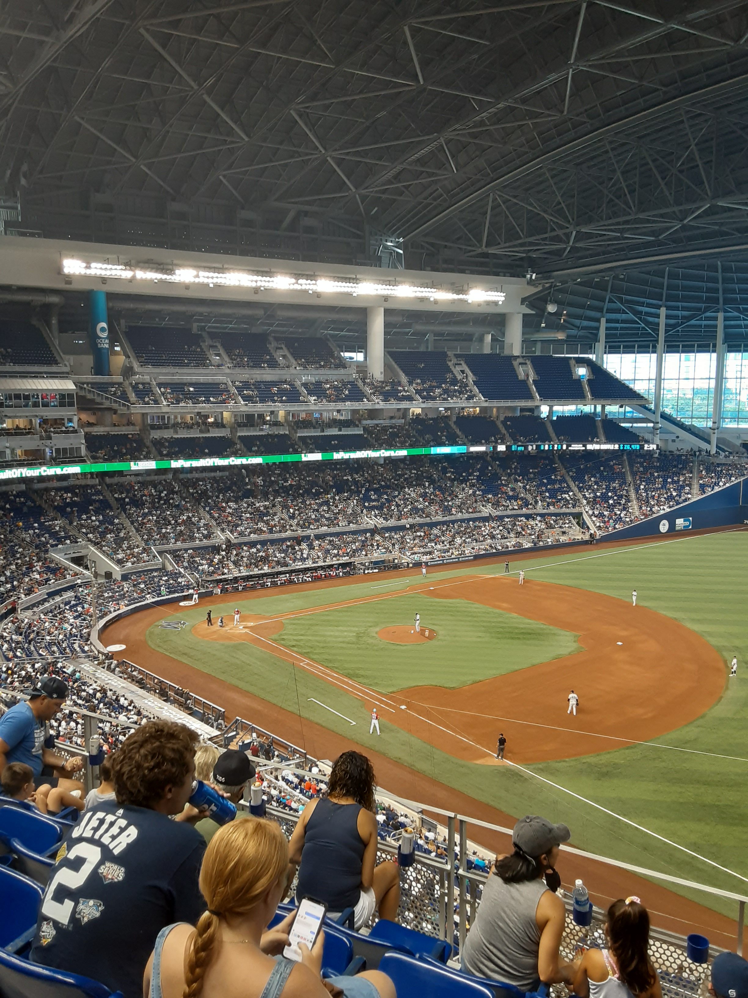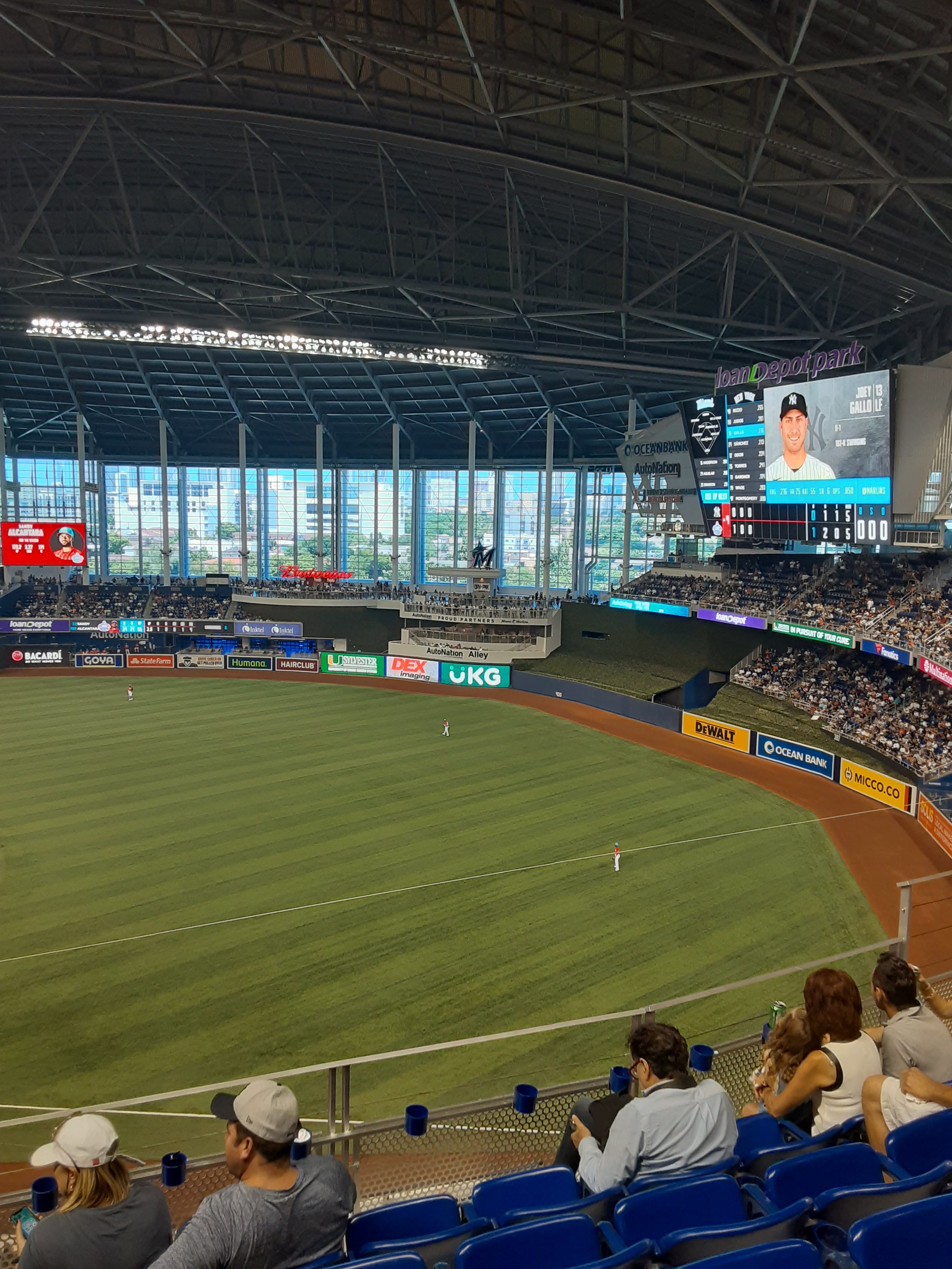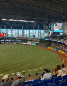 Arrivés en VTC, depuis l’université de Miami, difficile de vous parler d’ambiance dans les transports en commun ou autre, mais une fois sur place, nous pouvons nous apercevoir que l’attente ne sera pas énorme. Il y a très peu de portes d’accès engorgées, et si les accès aux casiers pour y ranger tout matériel interdit (j’ai eu l’audace/la bêtise/l’inconscience de tenter de passer avec une caméra 4k, oui, oui!) peuvent être un peu plus encombrés, les 20 000 spectateurs présents pour ce match ont fait de l’arrivée à l’intérieur du dôme une partie plaisante et plutôt rapide. Le match commence dans quelques minutes, mais nous avons l’impression d’être à quelques heures de ladite rencontre, même si des « Let’s go Yankees! » se font entendre alors que nous nous rapprochons des escalators nous amenant au troisième étage.