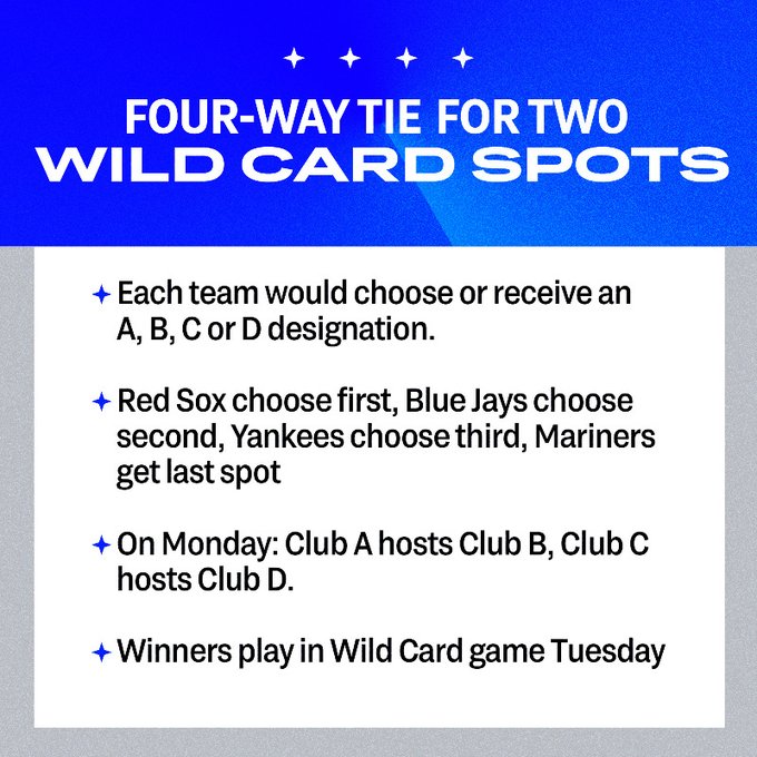 Une fois ces politesses d’usages réalisées et les choix stratégiques exécutés (Les Red Sox prendront le A, les Blue Jays le B mais que choisiront les Yankees ? Un match de Rivalry à Fenway ou un tout aussi périlleux déplacement au Canada ?), le reste du programme est relativement simple : A recevra B et C recevra D lundi, et le Wild Card Game se jouera comme prévu dans la nuit de mardi à mercredi.