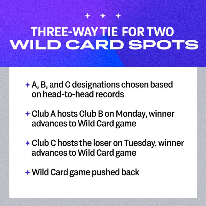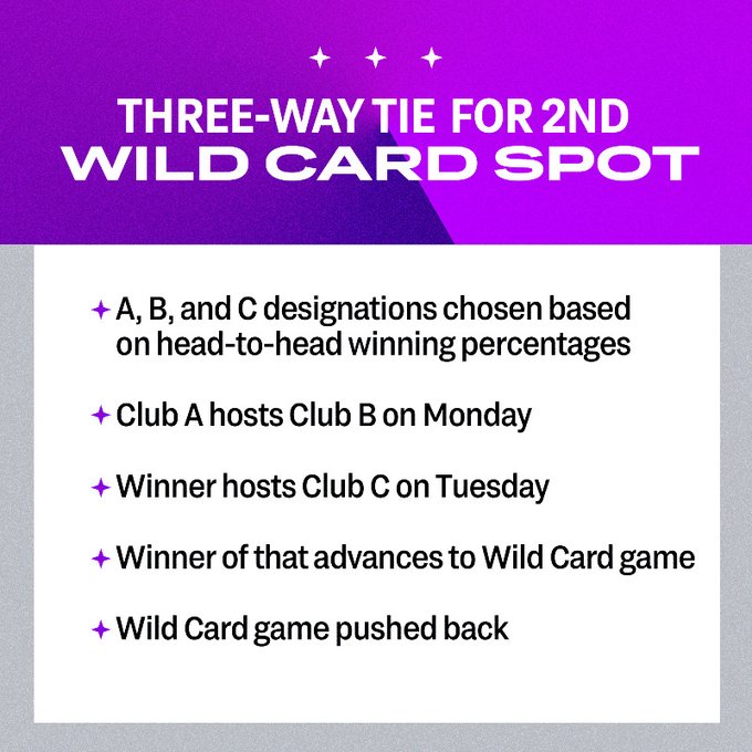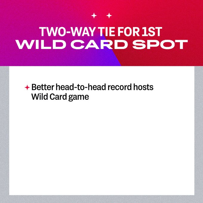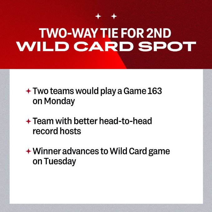 L’équipe avec le meilleur bilan aux confrontations individuelles reçoit son adversaire lundi, pour un match 163. Le vainqueur se déplace mardi pour jouer le Wild Card Game chez le vainqueur de la première Wild Card.