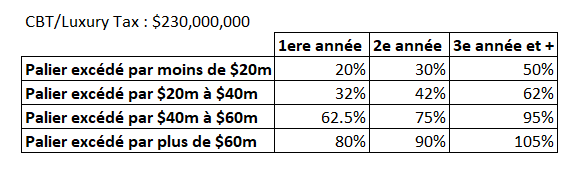 Actuellement, et cela continuera en 2022, les propriétaires dont le payroll total dépassera la limite de $230m devront payer 20% de la somme par laquelle ils ont dépassé ce palier la première année, 30% la deuxième année et 50% la troisième année et les suivantes. Ainsi, une équipe dont le payroll annuel serait chaque année de $10m au-dessus du palier se verrait imposer une amende de $2m la première année, de $3m la seconde et de $5m.