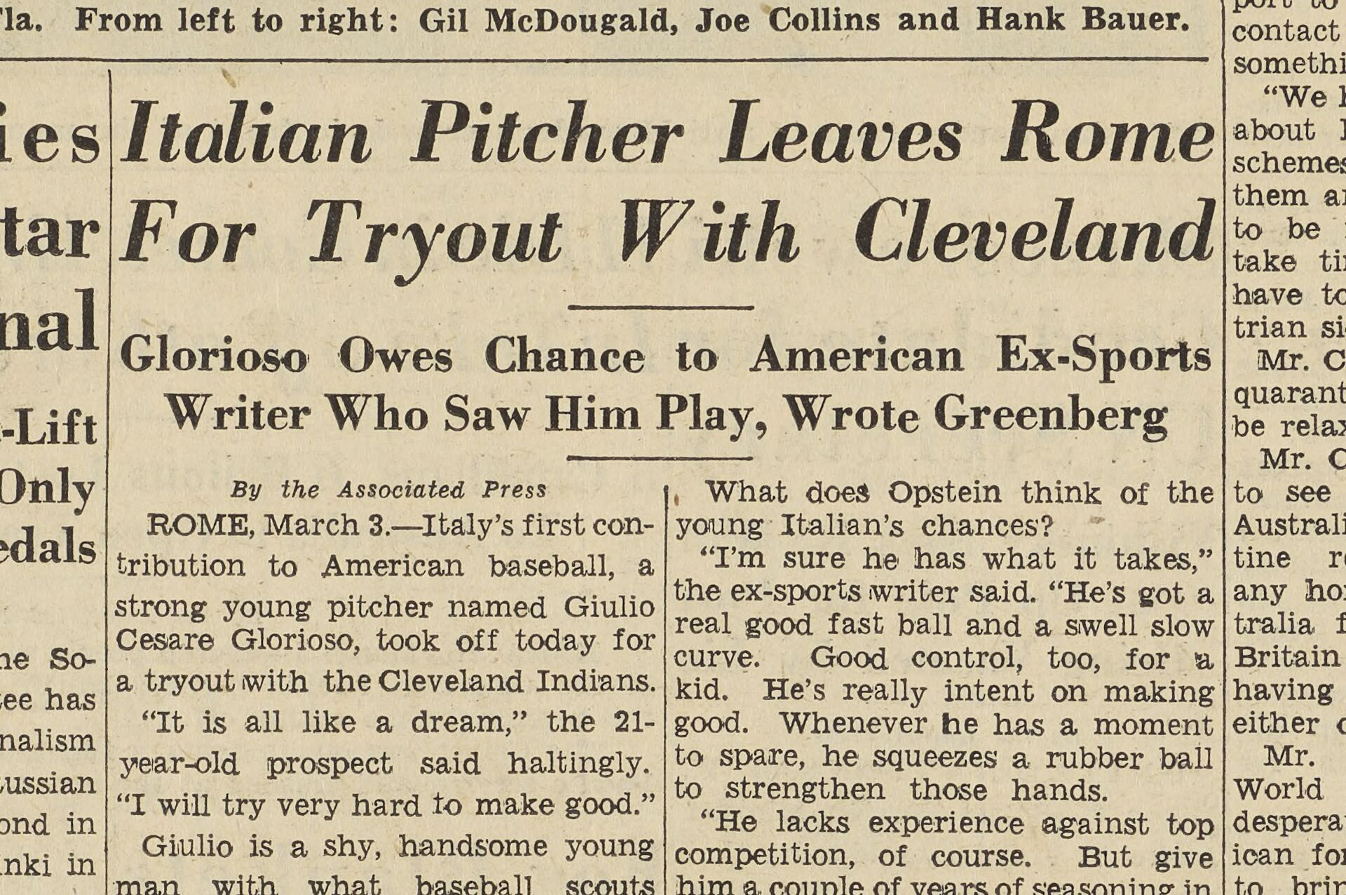 Voilà donc le jeune lanceur de 22 ans, par ailleurs étudiant en droit, qui rejoint, au printemps 1953, Daytona Beach pour se frotter aux prospects des Indians. C’est un ancien journaliste sportif de Chicago et coach à la Lazio, Kenneth Opstein, qui obtient cette expérience à Glorioso après avoir écrit au manager des Indians, le légendaire cogneur de homeruns et hall of famer, Hank Greenberg. Si beaucoup voient dans ce voyage, une vraie chance pour Glorioso d’essayer de devenir professionnel, ce dernier, lucide, dira en 2008, dans une interview au site Mister Baseball « Quoiqu’il en soit, à 22 ans, avec seulement deux années comme lanceur, je n’étais pas un prospect ».
