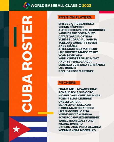 Malgré le déclin du baseball cubain, symbolisé par sa ligue élite qui a du mal à se mettre au niveau du baseball du 21ème siècle, Cuba compte encore de nombreux talents, dont certains se sont aiguisés dans les plus grands championnats pros. C’est d’autant plus vrai qu’un accord a été trouvé pour permettre aux joueurs cubains de la MLB de revenir en sélection nationale. Une première depuis la révolution castriste. Si le retour est encore modeste au niveau numérique, il amène quelques grands talents comme Luis Robert et Yoan Moncada, coéquipiers aux White Sox de Chicago. Luis Robert a sorti une solide saison en 2022 malgré qu’elle ait été minée par les blessures (284/12HR/2.1 WAR en 98 matchs). Celle de Moncada a été plus quelconque mais il reste un solide second couteau de la MLB (.253/82HR en 7 saisons MLB). Les autres joueurs MLB seront les releveurs Roland Bolanos (KC Royals) et Roenis Elias (Chicago Cubs, 9 saisons MLB) ainsi que l’infielder des Detroits Tigers Andy Ibanez. On pourra regretter l’absence des frères Gurriel ou des lanceurs Cionel Perez et Raisel Iglesias qui auraient donné une toute autre allure au roster cubain.