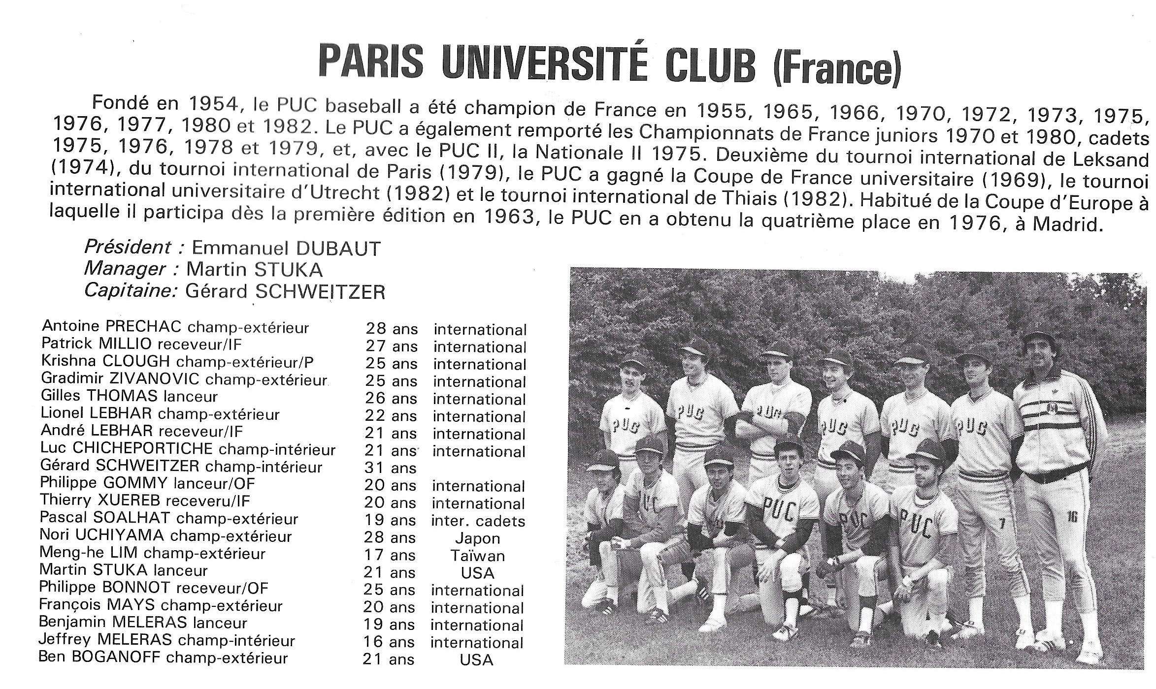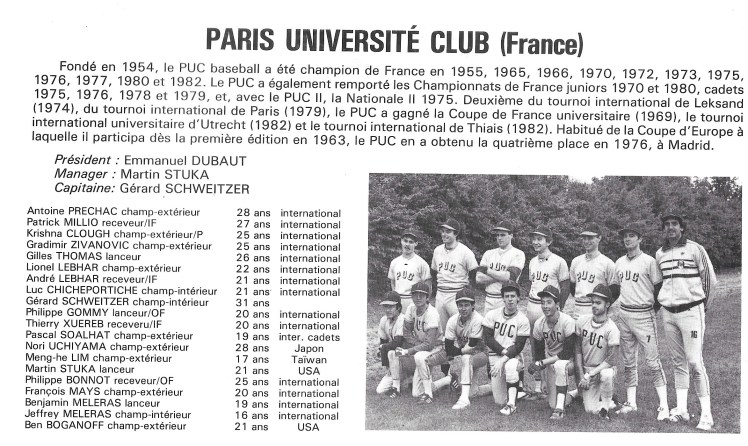 Pendant ma deuxième année a l’université, j’ai appris que le baseball serait un sport de démonstration aux Jeux de Los Angeles et des conversations sur le baseball en France me parvenaient mais par où commencer ? C’était longtemps avant internet. Premièrement, j’ai contacté le comité organisateur de Los Angeles qui m’a mis en contact avec Robert Smith, qui était le président de l’IBAF (International Baseball Federation), qui m’a expliqué qu’il y aurait quatre équipes dont une d’Europe, qui sera choisi lors d’un tournoi de qualifications à l’été 1983. A ce moment, il m’a donné les coordonnées d’Olivier Dubaut (président historique du PUC et membre de sa refondation en 1965, qui fut aussi vice-président à l’IBAF, ndlr).