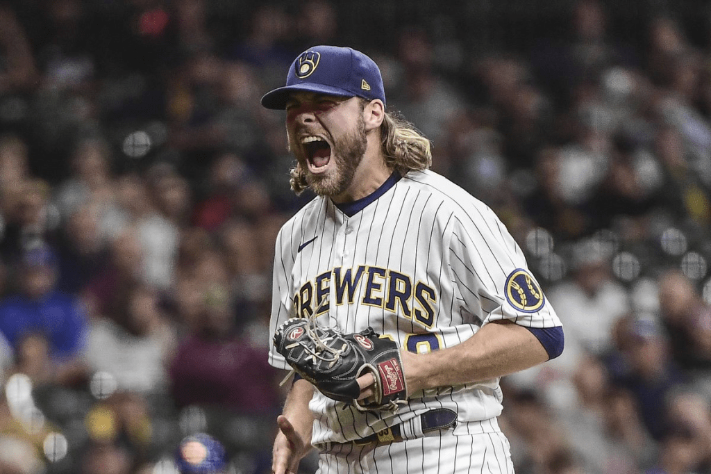 Voilà pour le bullpen mais la rotation n’est pas en reste. D’abord Corbin Burnes, perpétuel candidat au titre de Cy Young, qui a encore délivré une saison de haute voltige avec 3.39 d’ERA en 193.2 manches (son 2e plus gros total en carrière) avec 200K au compteur. Néanmoins, c’est la 2e fois de sa carrière (2019) qu’il termine avec un ERA supérieur à 3 d’ERA. Je sais pas si on se rend compte de cette stat de fou. Évidemment All-Star, Burner terminera 8e au classement Cy. Encore une saison de calibre ace pour le Californien. En revanche, et c’est le petit hic, il va complètement craquer lors de la Wild Card face à la fougue des Dbacks. 4 petites manches pour 4 points mérités. Et au final une élimination en sweep, bien triste.