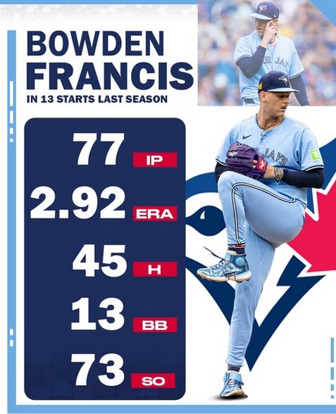 Dans la rotation, José Berrios est tout proche des 200 manches lancées (192.1IP) avec une ERA inférieure à sa moyenne en carrière (3.60 contre 4.07) et 16 victoires (son record en carrière). Troisième saison consécutive à au moins 30 starts pour Chris Bassitt (171IP) qui reste une ancre très fiable en milieu de rotation. Un dernier nom : Bowden Francis mais nous y reviendrons un peu plus tard dans cette preview.
