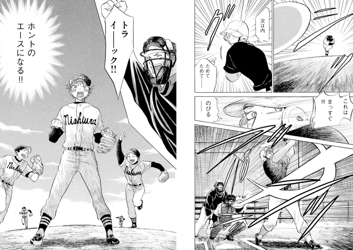 La réponse sera de montrer le baseball à travers le duel lanceur-frappeur à coup de techniques spéciales. En somme, le manga de baseball va revenir à la source, ce duel qui est au centre du jeu, mais en le sublimant grâce aux lancers magiques, appelés makyu, et la réponse des batteurs développant aussi leurs propres manières de frapper la balle. Ces lancers ou balles magiques peuvent paraître farfelues, et c’est le cas, mais les auteurs tenteront souvent de les expliquer plus ou moins scientifiquement afin de les rendre crédibles, que ce soit une balle qui disparaisse tout d’un coup devant la batte ou qui s’arrête quelques instants dans les airs grâce à un backspin pour déstabiliser le frappeur. Un ressort scénaristique que l’on retrouvera encore dans des mangas de baseball au 21ème siècle, comme la gyroball puis la gyro-fork de Goro Shigeno dans Major (la gyroball sera même attribué à un vrai lanceur, Daizuke Matsuzaka, passé notamment par les Red Sox de Boston) ou les lancers numérotés d’Eijun Sawamura dans Ace of Diamond.