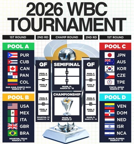Dans chaque poule, les équipes s’affronteront une fois pour établir le classement final. Les quarts de finale verront se croiser les poules A et B à Houston (1er A vs. 2e B ; 1er B vs. 2e A) ; et les poules C et D à Miami (1er C vs. 2e D ; 1er D vs. 2e C). Ces deux stades sont couverts, ce qui évitera tous risques de retard ou d’annulation à cause de la météo. Les demis et la finale se joueront en Floride, comme en 2023. La rédac de The Strike Out vous proposera une preview de chacune de ces poules.