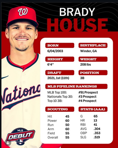 Depuis sa Draft en 2021 (11e choix), Brady House a toujours occupé une place de choix dans les rankings des meilleurs prospects et ses débuts en MLB étaient donc très attendus. Ils ont eu lieu l’été dernier après une première partie de saison stratosphérique en Triple A (AVG .301 entre avril et mi-juin avec 13HR et un OPS de .865).