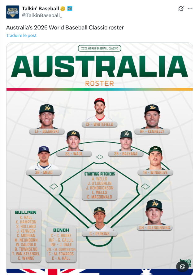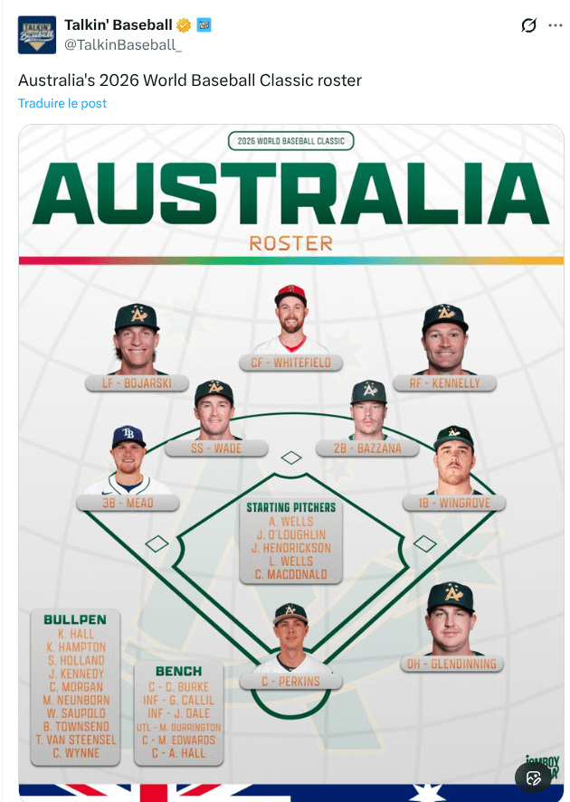 A l’approche de cette WBC 2026 , l’Australie se prépare à défendre ses couleurs avec un mélange intéressant de vétérans de la ABL ( ligue australienne)et de jeunes talents liés aux organisations MLB. Malgré une nation où le baseball professionnel est encore à ses balbutiements, les Australiens ont souvent surpris grâce à leur abnégation et leurs performances clutch sur la scène internationale. Cette édition pourrait confirmer leur montée en puissance.