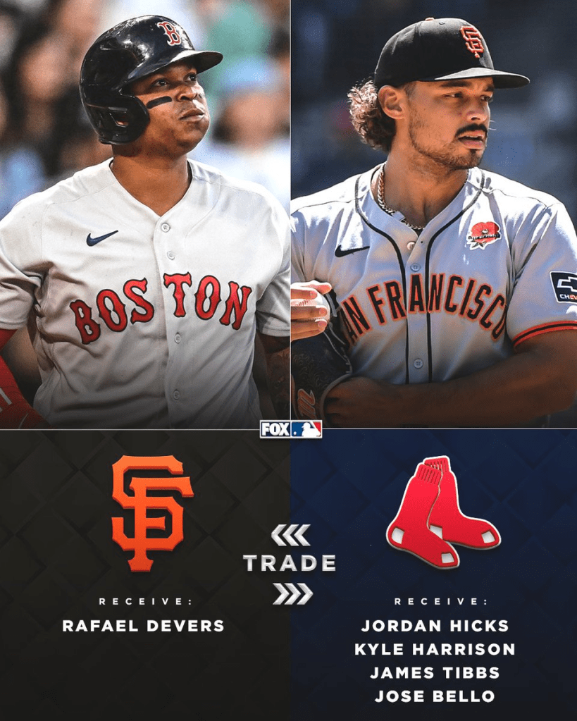 A la suite de cette déclaration, des rumeurs concernant la mauvaise attitude de Devers et son manque de fléxibilité ont commencé à fuiter dans la presse. Alors que par le passé, Devers a toujours été soutenu et reconnu pour son impact dans le vestiaire. La rupture a été définitive et le joueur a fini par être envoyé le 15 juin chez les Giants contre 4 joueurs (voir notre preview sur les Giants). Son départ avait été expliqué par le fait que son remplacement était déjà trouvé avec l’arrivée en MLB de Roman Anthony. On y reviendra.